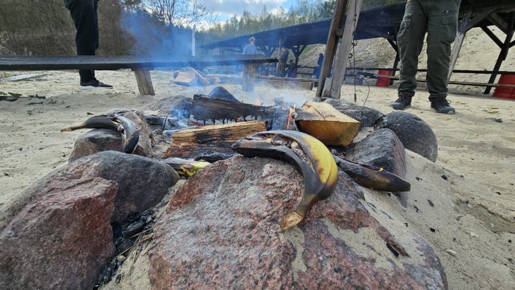 Energii dostarczało nam Słońce, którego tego dnia nie brakowało, kiełbaski z ogniska oraz słodki poczęstunek, banany z czekoladowym nadzieniem z ogniska serwowany przez Pawła.
