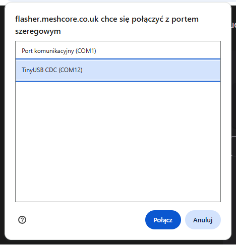 Webowy flasher MeshCore – wybór urządzenia i firmwareWybierz Companion Bluetooth