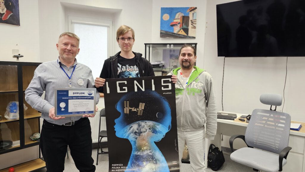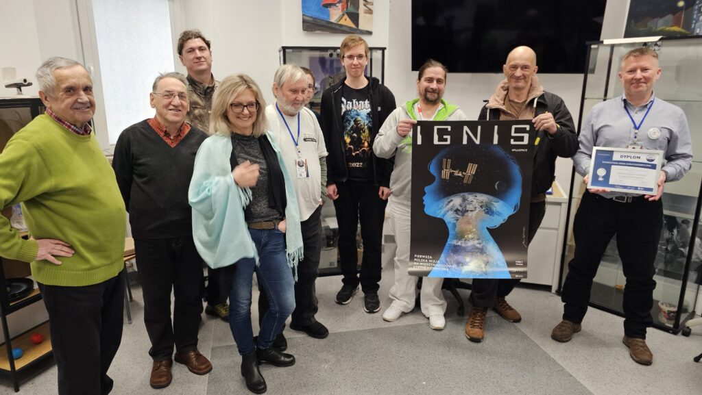- Uroczyście umieściliśmy w gablocie dyplom z Polskiej Agencji Kosmicznej otrzymany za udział w stratosferycznej misji Ignis w grudniu 2025. W grudniowym wydarzeniu uczestniczyli Piotr SP8X, Janusz SQ8V, Grzegorz SP8GCZ oraz uczniowie z Zespołu Szkół Technicznych w tym wówczas jeszcze nie będący członkami Stowarzyszenia (obecnie już tak) : Antoni SQ8AZT oraz Filip SP8ISO.